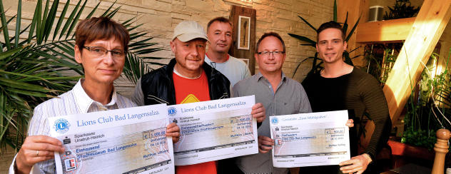 Das Geld stammt aus dem Erlös des 5. Benefizkonzertes der Lions, zu dem unlängst ins Stadtmuseum eingeladen wurden. Genauer gesagt in den Kreuzgang des Augustiner Klosters. Zum Eintritt in Höhe von 10 Euro war ein Konzert mit der Holger-Arndt-Connection aus Erfurt zu hören. 180 Besucher ließen sich dieses Erlebnis nicht entgehen. Im Anschluss an die Musik gab es noch eine Lasershow an der Fassade vom Kreuzgang. Außerdem wurde zum Catering eingeladen, und es war Gelegenheit noch bis Mitternacht für ein geselliges Beisammensein. Wie in den Vorjahren wurden erneut die Einnahmen aus dem Benefizkonzert für gute Zwecke in Aussicht gestellt. Das Stadtmuseum kommt dadurch wieder ein Stück bei der Restaurierung eines mittelalterlichen Altarretabels voran. Erste Arbeiten erfolgten bereits, nun muss weiter Geld gesammelt werden. Bei dem guten Stück aus dem Jahr 1492 handelt es sich um geschnitzte Heiligenfiguren. Der Altar stammt aus einer Kapelle des ehemaligen Siechenhofes von Bad Langensalza. Bisher konnten 4500 Euro für die Restaurierung verwendet werden. Auch Fördermittel waren erreichbar. Wie viel Geld noch fehlt, kann Sabine Tominski noch nicht abschätzen. Jürgen Tabbert, Vorsitzender vom Kulturverein Stadtmauerturm, rief zur Spendenübergabe ein besonders Projekt in Erinnerung: das Bootscamp Mirow in Mecklenburg-Vorpommern. Das ganze Jahr über kümmert sich der Verein um kulturelle Angebote und sorgt sich dabei besonders um Kinder und Jugendliche. Mit dem Bootscamp ist es möglich, Freizeiten für die Kinder zu organisieren. Ein in Besitz des Landkreises befindliches Objekt in Mirow wird vom Kulturverein betrieben und hat schon seit 1963 eine langjährige Tradition. Besondere Bedeutung gewinnt die Jugendarbeit vom Verein, da im Landkreis laut Jugendförderplan eine neue Struktur Einzug hält. Es werden einige Betreuerstellen gestrichen. Sabine Tominski nahm 1000 Euro mit ins Stadtmuseum, Jürgen Tabbert sowie Michael Borgwardt freuen sich über 1500 Euro für den Kulturverein . Und Gordon Keiling vom Gasthaus "Zum Mühlgraben" und zuständig fürs Konzert-Catering übergab an die Lions 500 Euro