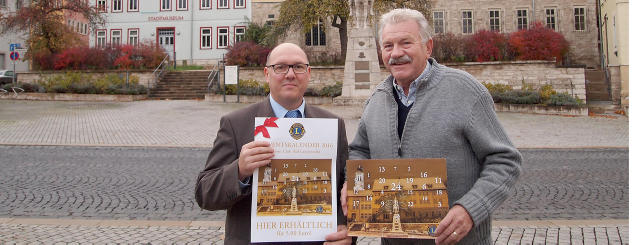Jan Fischer (links) und Rolf Krause präsentieren den Lions-Adventskalender 2016. Auf dem Titelbild ist der Nackte Reiter vor dem Bad Langensalzaer Augustinerkloster. Foto: Friedemann Knoblich Bad Langensalza. Jedes 46. Los gewinnt. Bei dieser Quote können die staatlichen Lottobetriebe nicht mithalten. Der Lions-Club Bad Langensalza ermöglicht diese vergleichsweise hohe Gewinnchance auch in diesem Jahr wieder mit einem Adventskalender. 2300 Stück sind fertig gedruckt. "Viele Firmen aus der Stadt haben Kontingente für ihre Mitarbeiter bestellt, daher sind wir mit der Menge dieses Jahr etwas in die Höhe gegangen", berichten JanFischer, Rolf Krause und Jürgen Werner bei der Vorstellung des Kalenders am Donnerstag. Dennoch soll es im freien Verkauf noch genügend Exemplare geben. Vom 1. bis 24. Dezember werden insgesamt 50 Preise vergeben. Jeder Kalender hat eine feste Nummer. Die Gewinn-Nummern werden täglich in der Thüringer Allgemeine, der Thüringischen Landeszeitung und auf der Webseite des Lions-Clubs veröffentlicht. Jeder Preis soll einen Wert von mindestens 50 Euro haben. Das können Einkaufsgutscheine, technische Geräte oder eine Reise im Wert von 1000 Euro sein – diese verbirgt sich hinter Tür 24, so viel sei verraten. Die Gutscheine und alle anderen Preise werden von örtlichen Händlern und Unternehmern gesponsort – der Gegenwert der Gewinne bleibt also in der Stadt. Ohne diese Unterstützung wäre die Aktion nicht möglich, betonen die Lions und zeigen sich dankbar. Der Erlös soll wie in den vergangenen Jahren sozialen Projekten zugutekommen. So werden unter anderem der Kulturverein Stadtmauerturm unterstützt, das Thepra-För- derzentrum in Bruchstedt, die Bad Langensalzaer Tafel und das Museum in Bad Langensalza. Für die evangelische Kita in Ufhoven will der Club die Innenausstattung mit finanzieren. Die Kalender sind ab dem kommenden Montag, 7. November, für 5 Euro erhältlich. Verkauft werden sie bei der Sparkasse, in der Salza-Buchhandlung, im Reisebüro König, bei Intersport Schenk, in der Tourist-Information und der Friederikentherme.